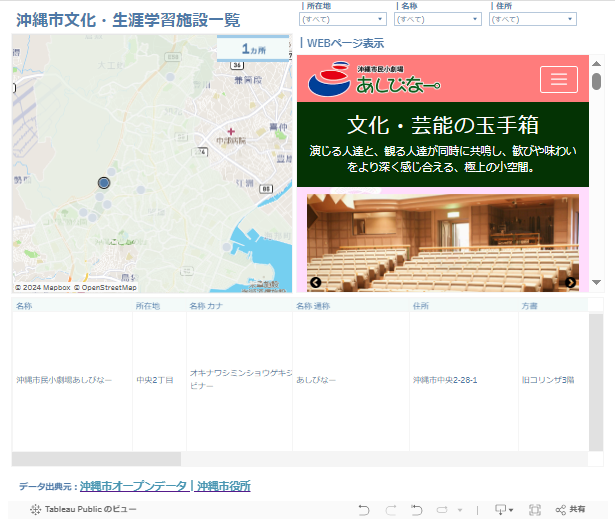 | 市内のスポーツ施設を地図上で可視化しました。 | 市内の文化・学習施設を地図上で可視化しました。 | 沖縄市オープンデータセット「文化財一覧」をまとめました。 |