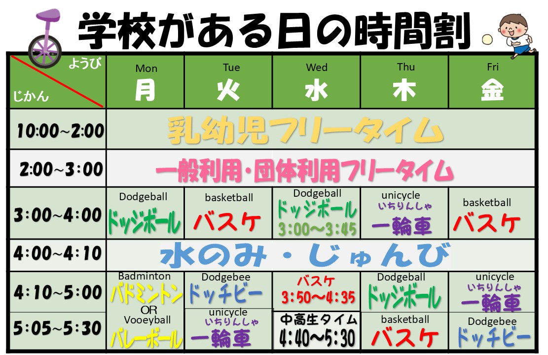 学校休業日(夏休み、冬休み、春休み、土曜日、振り替え休み)に、開館時間前から来館するがこどもたちがいます。開館時間まで職員不在のため、安全面の見守り観点から児童館への来館は午前10時以降よりとお願いします。こども達の安全と事故防止しの為ご了承ください。