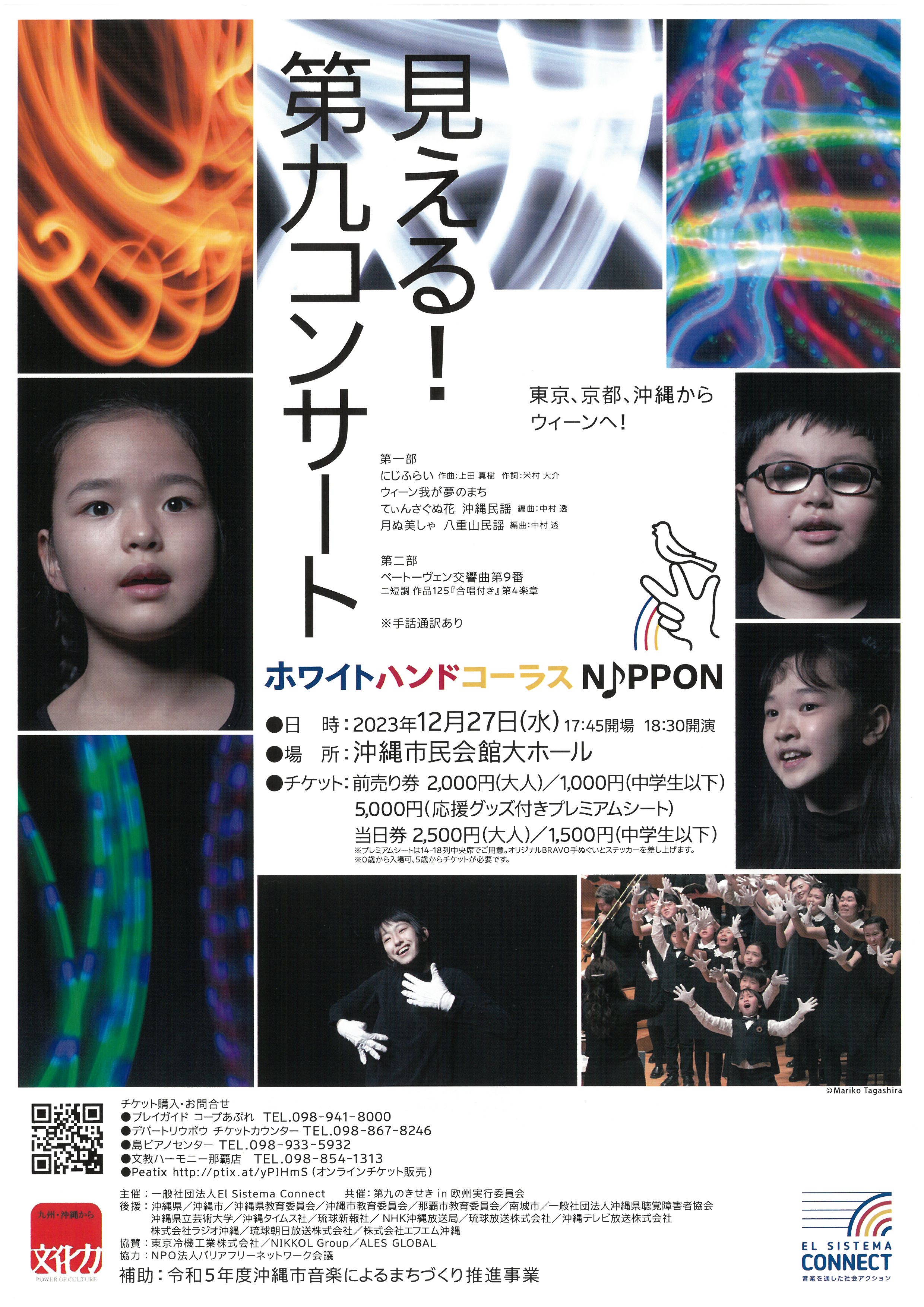 ホワイトハンドコーラスは、障がいの有無に関わらず多様な子どもたちが参加し、手の表現で歌うサイン隊と合唱で歌う声隊で、音楽を表現する合唱隊です。公演の詳細はチラシをご参照ください。