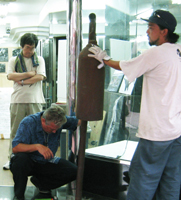 今月七日、いよいよ市民待望の「ヒストリートII」がパルミラ通りにオープンします。同室は、「ヒストリート」の兄弟館だった「しーぶんかん」を発展的に解消して新たに開室するもので、展示スペースもかなり広くなりました(ヒストリートの三軒隣り)。 ヒストリートIIでは、日本道具学会の村瀬春樹さんより寄託された国内外の「戦中・戦後の転用品・代用品」、報道カメラマンの石川文洋さん提供のベトナム戦争や戦後沖縄の写真をメインに展示。 また、展示室の出入り口には住吉自治会が提供した酸素ボンベ製の半鐘を設置しました。戦後まもない物が乏しかった頃は何でもリサイクルして使うのが当たり前で、使用済みの酸素ボンベは鐘に利用されました。ボンベ鐘は学校では時鐘用、集落では隣近所の寄り合いの集合を告げたり、遊んでいる子ども達に帰宅時間を知らせていました。展示しているボンベ鐘は住吉区内の鉄工業者が「防犯や連絡に役立てて」と区に寄贈したもの。区では婦人会やエイサー練習の開催を知らせていた他、酔った米兵が集落に侵入してくると、鐘を打ち鳴らして追い払ったそうです。 半世紀に渡り地域を見守ってきたボンベ鐘をはじめ、数多くの貴重な資料を展示したヒストリートII。ぜひ足をお運び下さい。 |
