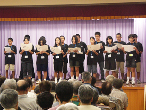 また、今年度は、現行の中学生平和大使十六人に加え、社会人大使として新たに三人の大使が加わり、八月八日から十一日にかけて沖縄市平和大使として平和学習と交流等を行うため長崎市へ派遣された。大使らは八日、青少年ピースフォーラムへ参加、被爆体験講和や他県との学習交流会を行った。