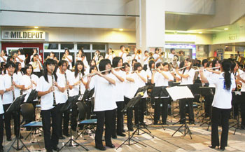 八月に開催された九州吹奏楽コンクールを勝ち抜き全国大会へとコマを進めたコザ高、美里中、山内中の吹奏楽部の資金造成に一役買おうと、こども達応援イベント『響け世界へ!』(主催・ミュージックタウン音市場)が、十月十七日夕方、ミュージックタウン音楽広場で開かれた。