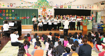 地域の発展と一足早いクリスマスを味わってもらおうと南桃原公民館で歌のサークル活動を行っている混声合唱団「フォレスト」(上原正高団長)のみなさんが十二月二十一日、山内幼稚園(和宇慶江里子園長)の園児八十七人とクリスマス交流会を開いた。