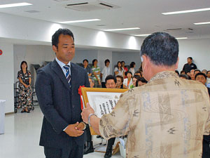 九月十二日に行われた沖縄市議会議員選挙で当選した三十人の新議員への当選証書付与式が十五日午後市役所庁舎内で行われ、上地康雄選挙管理委員長から一人ひとりに当選証書が手渡された。東門市長は「これから四年間、沖縄市のために一緒に仕事をしていきましょう。今後の活躍を期待しています」とあいさつ。当選人を代表して桑江直哉議員が「市民を主人公とし、市民の代弁者として、市民の立場から行政をチェックし、開かれた市政を築き市政発展のために頑張ります」と抱負を述べた。 |