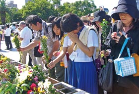長崎に着いた日、最初に訪れた原爆ホーム「恵みの丘」で被爆者の方々歌ってくださった「千羽鶴」のあの澄み切った美しい歌声が心に浮かぶ。五十年の歳月は「今後七十年間、如何なる生物も育たないだろう」と言われた長崎の町を見事に近代的な都市へと復興させた。けれど、年月がたっても決していやされることのない深い深い悲しみがそこにはあった。「身体のケアよりも心のケアのほうが大変なんですよ。今でもまだあの時のことは言葉にできない方もいらっしゃるんです」の職員の言葉に長崎もまた、いまだに癒えぬ戦争の傷痕を抱え続けている町であることを実感する。