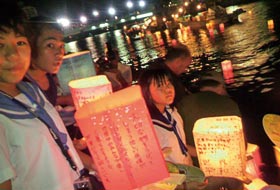 ▲平和を誓い原爆犠牲者慰霊灯ろう流しへ参加する平和大使ら |