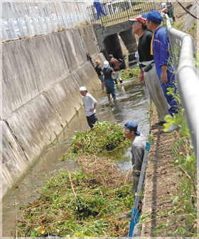 大切な川です。私達の心できれいに。多くの市民が参加、心地よい汗を流す