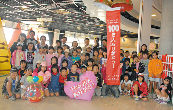 12月14日、沖縄こどもの国にある「ワンダーミュージアム」の入館者が100万人を突破し、その記念セレモニーが同日、行われた。社会見学で同園を訪れた八重瀬町立新城小学校の1、2年生が記念の入館者となった。ミュージアムは今年で7年目を迎える。