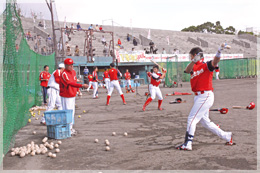 「破天荒」〜前人未踏〜をキャッチフレーズに沖縄市で今年三十一回目の春季キャンプを張る広島東洋カープの野村謙二郎監督が率いる選手らが一月三十一日、沖縄入りした。