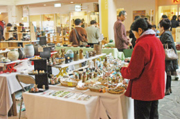 ▲会場いっぱいに並べられた工芸品を楽しむ来場者