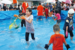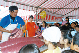 まつりは朝十時に開始。この日は天候が悪く客足が心配されたが、開始前から長蛇の列ができ、まつりの人気ぶりがうかがえた。試食コーナーでは、シーフードカレーとマグロ丼が用意され、来場者は海の幸を用いた料理を味わった。マグロ解体ショーは、人だかりが出来るほどの人気で、マグロが豪快に解体される様子を目の当たりにし、子どもも大人も驚きと興奮の声を上げた。解体されたマグロはその場で即売された。その他、魚のつかみ取りも整理券がすぐに売り切れるほどの人気で、子どもたちはプールの中を濡れながらも、魚を手づかみで取った。ビクビク動く魚に「こわい」という声があがったものの、楽しそうな様子だった。