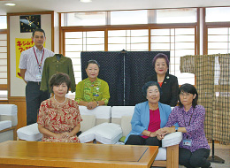 ▲知花花織と国民服を寄贈した金城タケさんの次女、島袋悦子さん(前列左)と芭蕉布を寄贈した池原ノブさん(前列中央)