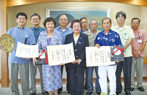 道路愛護等の活動を行い、その功績が顕著な団体に国土交通省、関係団体が道路愛護功労者として毎年八月に感謝状を授与しているが、今年は沖縄市から三団体が受賞し、八月十日、市役所に東門市長を訪れ喜びの報告を行った。