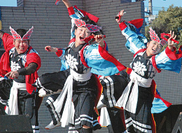 ▲自慢のコスチュームで観客の目も楽しませた、よさこい鳴子踊り