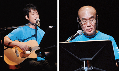 朗読劇を披露するSADAKO LEGACYの佐々木雅弘理事長(右)と佐々木祐滋副理事長(左)
