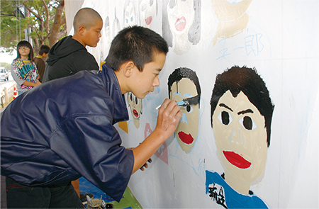 壁画制作は、繰り返される落書きに頭を悩ませている西日本高速道路株式会社九州支社沖縄事務所が落書防止として効果のある壁画制作を昨年に引き続き同校に依頼したもので、今回で2回目。壁画制作では6年生の全生徒(2クラス77人)が橋脚にそれぞれの自画像を初日にチョークで下書きし、二日目に水性塗料で色を塗り完成させた。