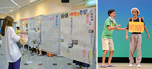 【左】広島研修を終えた平和大使が作った新聞 【右】FECのコント「お笑い米軍基地」