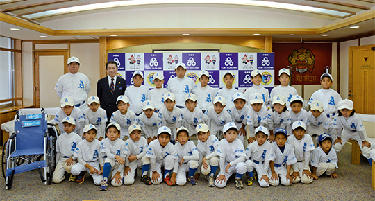 少年野球チームの安慶田ライオンズが11月6日、沖縄市役所を訪れ、車椅子2台を寄贈した。