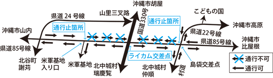 | 4. 時間 | 午後10時から翌朝午前6時まで 国道330号(ライカム交差点)から県道85号線へは通行可。 県道85号線から国道330号(ライカム交差点)へは通行不可(ライカム交差点向け通行止) |