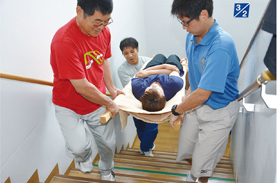 受講した職員らは、毛布で担架を作って搬送の訓練を行い、難関の階段では声をかけ合い、チームワークを発揮して搬送した。