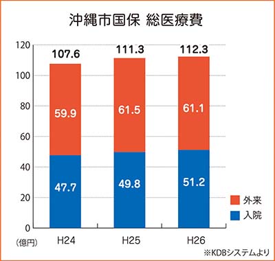 沖縄市の国保総医療費は、平成24年度は107.6億円、平成25年度は111.3億円(前年度比+3.6億円)、平成26年度は112.3億円(+1.0億円)と年々増え続けています。 生活習慣病が占める割合も大きく、沖縄市の喫緊の課題となっています。そして、外来受診が少ない一方で、悪化が進んで入院となる人が多い事も医療費を上げる要因となっています。