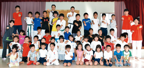 空手の世界チャンピオン喜友名諒(りょう)氏を講師に迎え、英語も学びながら空手で体をきたえる空手&イングリッシュ道場(コザインターナショナルプラザ主催)が、8月15日に大里公民館で開催された。幼稚園から小学生のこども達が参加し、空手と英語を習得しながら楽しんでいた。