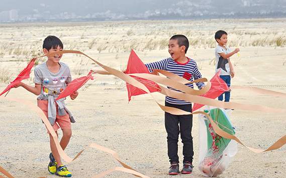 凧あげは、こども達が伝統文化と地域への関心と愛情を育むきっかけを作ること等を目的に開催されていて、今回で3回目となる。凧は、12月16日、泡瀬公民館でこども達が手作りした。