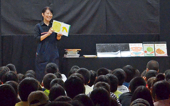 今回は、こどものまち宣言10周年にちなみ、楽しく食べることの大切さについて考えるために「たべもののおはなし」をテーマとした図書館職員による素話や大型絵本の読みきかせ、ブックトークのほか、読み聞かせボランティア「ゆいゆい」による手遊び人形やペープサート、参加型手遊びが行われた。