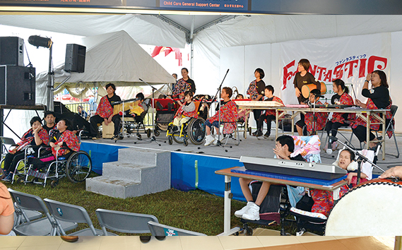野外特設ステージでは、福祉団体によるダンスや楽器演奏、公立保育所のこども達によるダンスなどさまざまな舞台プログラムが披露され、多くの来場者で賑わった。