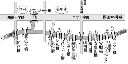 (1)ウルマシ橋→(2)安慶田バイパスボックス→(3)安慶田橋→(4)橋口橋→(5)山崎橋→(6)ハンザ―橋→(7)昭和橋→(8)泉作橋→(9)松本橋→(10)知花橋→(11)カフンジャー橋→(12)松本緑地公園