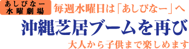 | ▲昨年のお笑いポーポーから | | 毎週水曜日は沖縄芝居を堪能しょうー。十月一日から市民小劇場あしびなーで「あしびなー水曜劇場」(主催・市自主文化事業実行委員会)が行われている。同企画はかつてテレビでも人気番組だった沖縄芝居の「水曜劇場」を復活させ、沖縄芝居ブームに再び火をつけようというもの。昨年から行われている。