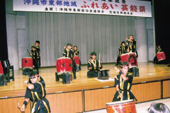 同芸能祭は太鼓・三線・踊りにより、地域の古典民俗芸能の文化的営みを催すことでお互いの結束と連帯を深め、地域の躍進とこれからの市東部地域の文化や伝統芸能の継承・発展に繋げることを目的として開催。東部十の地域と一同好会(古謝、大里、泡瀬第一、東桃原、与儀、泡瀬、海邦町、比屋根、高原、泡瀬第三、泡瀬三線同好会)から、子ども達や自治会、婦人会などによる太鼓や民謡、舞踊などが披露され、訪れた観客はおよそ二時間にわたり、各地の芸能を大いに楽しんだ。