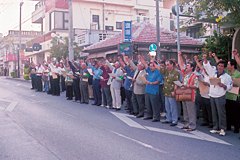 | 今年の5月に市内で指定暴力団が事務所を構えているのが発覚したことで10 月31 日、暴力団壊滅沖縄市民対策会議(仲宗根正和会長)は市中央公民館で緊急市民対策会議を開いた。地域住民の平穏な生活を脅かし、平和な市民生活を混乱させるばかりでなく、次代を担う青少年に悪影響を及ぼすことが必死であるとして開かれた同対策会議では、暴力団事務所前で事務所撤去を求めて「市民の敵、暴力団は許さんぞ!」「暴力団は平和な街から出て行け!」と暴力団の壊滅を目指して地域住民とともに抗議を行った。 | |