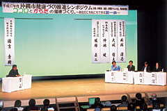 多くの市民が熱心に聞き入ったパネルディスカッション | | | ココロとからだの健康づくり。〜あなたにも私にもできる第一歩〜、市は第九回市健康フェアに先がけ二月三日、市民小劇場あしびなーで「市健康づくり推進シンポジウム」を開催した。