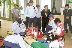 ▲市役所ロビーでは、市役所を訪れた 市民を前に市消防救急隊と 中部徳洲会病院特別医療救護班との 救命処置訓練が行なわれた | |