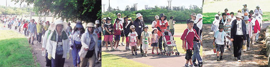 家族や友人、みんなで楽しく歩こう─。第一回健康ウォーク(主催市、市食生活改善推進協議会)が七月三十日、県総合運動公園で開催された。約三百人の市民が、三キロと五キロのコースに分かれてウオーキングで汗を流した。開会式で真喜志末子同協議会会長が「海の香りと涼しい風を感じながら歩きましょう」と話し、東門市長は「長寿の島沖縄を取り戻し、市民の活力あふれる沖縄市を実現するためにも、食事と運動の大切さを再確認し、生活習慣を見つめ直す良いきっかけにしてください」とあいさつ。東門市長の号砲でスタートすると、参加者らはそれぞれのペースで約一時間かけてコースを歩いた。
