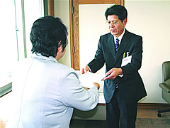 | ▲宮平清沖縄美里郵便局長(右)から東門市長へ目録が手渡された | 郵便物の誤配や遅配を防ぎ、また、警察や消防署からの緊急車両や訪問者等に解りやすい住所にするため、池原地区の一部の住居表示を変更し池原1丁目〜5丁目が新設される。それに伴い4月24日、宮平清沖縄美里郵便局長から東門市長へ住居表示板1,000枚と住所変更通知ハガキ30,000枚、配布用封筒1,100枚が寄贈された。住居表示の変更は8月13日から実施され、同地区の住居表示は「○丁目○番○号」となる。これに伴い、8月11日(土)、12日(日)は住所書き換え作業等により住民票等自動交付機の利用が出来なくなります。