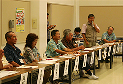 | ▲自治会長たちは地域の抱える問題や意見・要望を挙げて、関係者たちと解決策を探っていった | 沖縄警察署長と市自治会長協議会との「地域の安全を語る会」が八月二十一日、市産業交流センターで行われた。石垣博道署長による管内の犯罪情勢説明では、少年犯罪が増加している傾向や、免許取得から十年を超えるベテランドライバーの事故が増えてきている事などの事例が紹介された。その後の意見交換会では、自治会長から「東部地域は人口も増えており、安全の為にも交番の設置をお願いしたい」との要望に対し「現在検討中であるが設置までには時間がかかるので、現在は人員増で対応している」との回答があった。