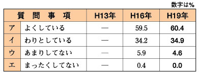 〔考察〕「よくしている」「わりとしている」の項を合わせると95%にもなり、望ましい傾向であると考える。欲を言えば「よくしている」がもっと高い数値を示してほしいと思う。