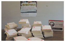 ▲官製ハガキなどの書きそんじハガキで教育支援を行っています 市PTA連合会(仲田朝俊会長)では、書きそんじハガキ(宛先を書き間違えたなどで未投函の官製ハガキなど)で換金した資金で、基礎教育を受ける機会を得られなかった人たちの教育を支援していく「書そんじハガキ・キャンペーン」を行っている。同キャンペーンは、発展途上国の子どもたちや非識字者へ学びの場を提供し、識字教育などの支援を行っているユネスコの世界寺子屋運動の一環として実施しているもので、同連合会では市中央公民館内の事務所前に回収ポストを設置し協力を呼び掛けている。