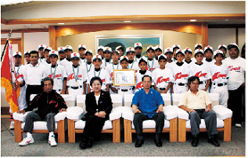 ▲「全国大会で旋風を巻き起こしたい」と意気込むコザボーイズの選手たち 5月10、11日に開催された中学生硬式野球のボーイズリーグ夏季県大会で初優勝したコザボーイズ(仲村渠清代表)が6月2日、市長を訪ね優勝及び全国大会出場報告を行った。仲村渠代表は「チーム結成6年目で勝ち取った優勝。チームワークを活かして全国で旋風を巻き起こしたい」と期待に胸を膨らませる。東門市長は「自分の描いている夢をしっかり実現できるようにがんばって欲しい」とエールを送った。同チームは8月2日から開催する全国大会(大阪市)と、8月12日から開催する九州大会(福岡市)に出場する。
